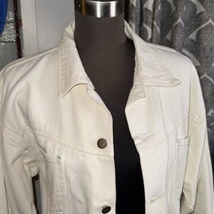 Vintage Y2K Freeze white distressed denim trucker jacket. Size medium. In excellent condition with the exception of some fraying above one of the button holes. Size medium. Measures 22” across the chest, 21” long & has 20” long drop sleeves.