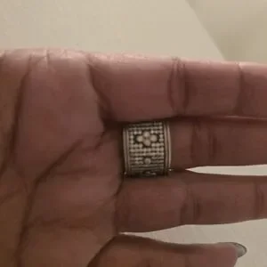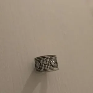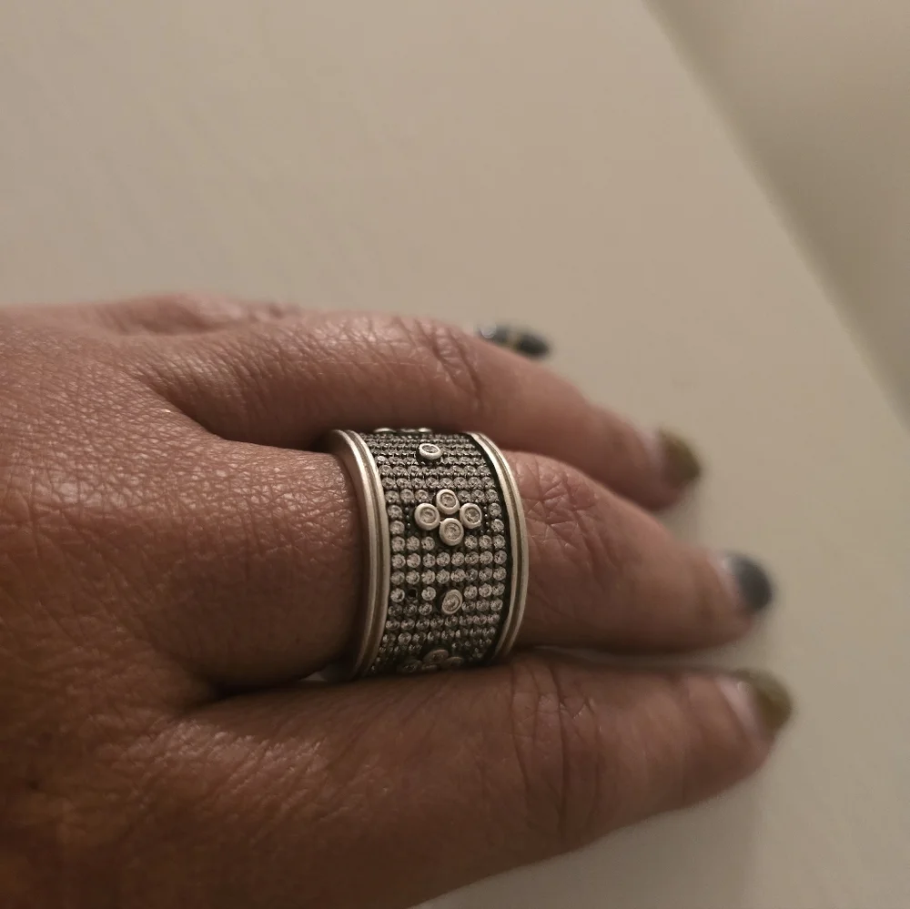 Freida Rothman silver toned ring. Covered with paves all the way around with little flowers ever so often. Size 7. ***NOTE*** One pave missing as seen in last picture.