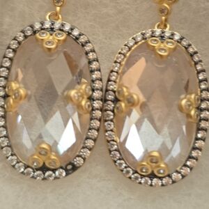 Freida Rothman Dangle earrings. Clear faceted stone. Trimmed in black and gold. ****One small stone missing near the bottom of one earring as pictured. ***