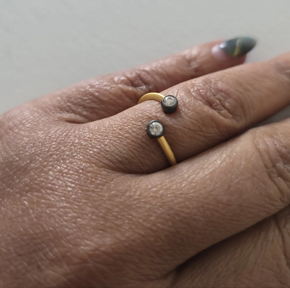 Freida Rothman; bypass ring. Two bezel set CZ's on each end, surrounded by black. Size 7 but can be made small or larger due to it's opening.