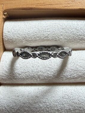 Elegant silver-tone ring featuring a delicate marquise pattern. Designed for comfortable stacking and everyday wear. Subtle engraved details add refined texture to the silver finish.