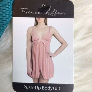- open front babydoll chemise with sequin and bow embellishments at neckline and delicate lace overlay.