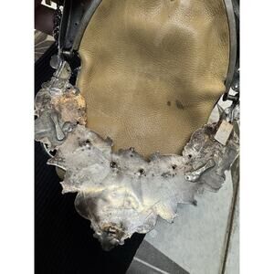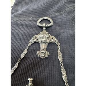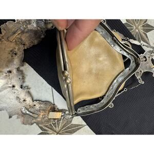 Good antique condition with expected age wear. Leather shows spots and surface wear; silver frame has tarnish and patina, which could be polished if desired. Chain is secure. Please see photos for details.