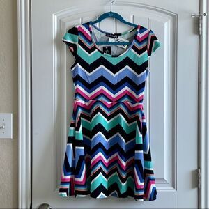 French Atmosphere Multicolored Short Sleeve Chevron Print Skater Mini Dress; SZ L; BNWT