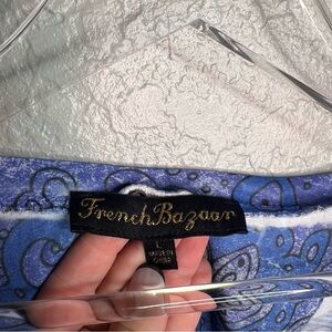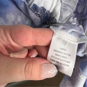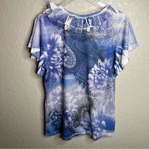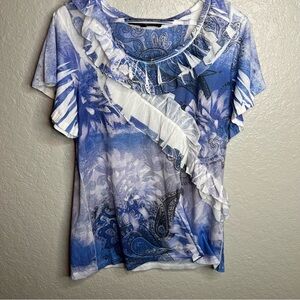 The top is in good condition it’s a nice shirt. It’s a soft material with some pretty sequences on it.