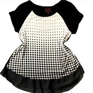 Description: Mixed Media Geometric Polka Dot, Solid, & Chiffon Section Short Sleeve Tee Top