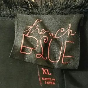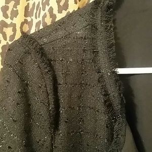 French Blue dressy lightweight jacket Worn twice 90% Acrylic 10% polyester with Fringe detail on collar, lapel, sleeves and hem Black with shiny black threads as shown in pic 3 Measurements 21 1/2 inches from armpit to armpit/22 inches waist/ 24 inches from top of shoulder to bottom seam ** BUNDLE AND SAVE 15 % OFF 2 + ITEMS **