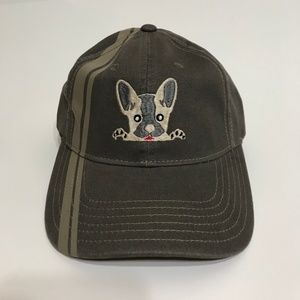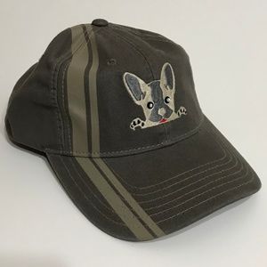 Solid green olive with gold mate strips, embroidered a cute French bulldog head in gold mate, grew, red, black and white colors.