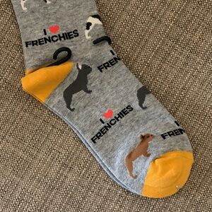 Fun socks with French Bulldog design. Gray base with yellow accents. Perfect for dog enthusiasts.