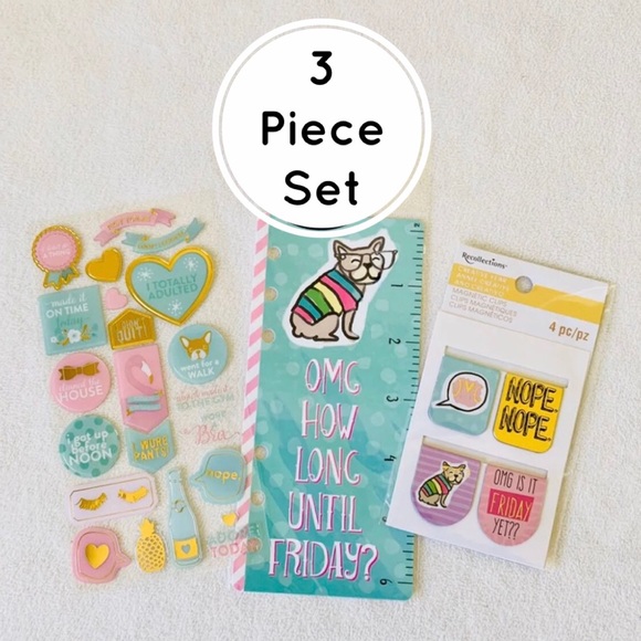 New in package. Darling three piece set of planner or crafting accessories featuring an adorable French Bulldog. Set includes 1 page of stickers featuring Frenchie’s and cute messages (perfect for a planner), a planner bookmark featuring an adorable frenchie and 4 matching magnetic clips that are perfect as page markers and also make darling fridge magnets. A portion of my sales go to dog rescue. 🐾