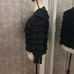 Elegant black jacket with layered ruffles. Features a stylish zip-up front. Perfect for adding flair to any outfit. New, no tags