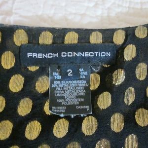 French Connection 2 Navy/Metallic Gold Circle Tie Back Silk Blend Top. This top is in a gently worn condition with no rips or stains. Neck is faux wrap.