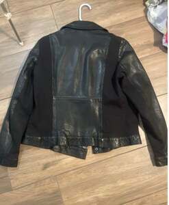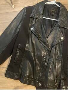 French Connection Black Leather & Knit Moto Jacket, Size 10. This stylish jacket features a classic moto design with a combination of genuine black leather and knit panels for comfort and flexibility. Excellent pre-owned condition, with no visible flaws.