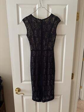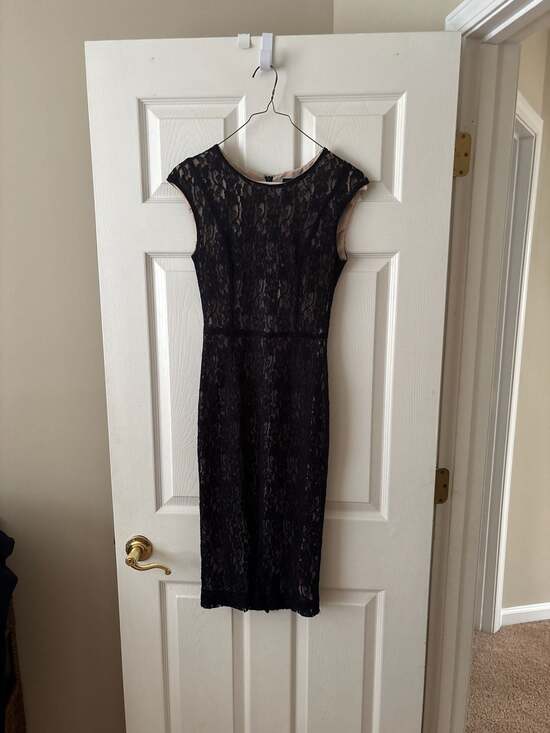 French Connection Black Lace Sheath Dress, Size S — Sophisticated and classic evening wear.