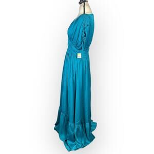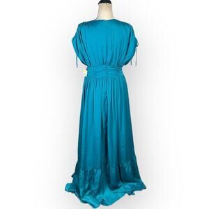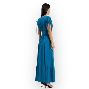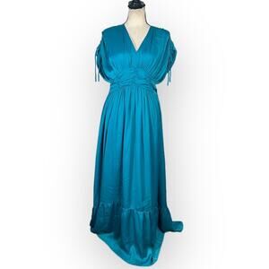 French Connection Audrey Dress Women's 6 Blue Satin Maxi V-Neck Cinched Sleeves