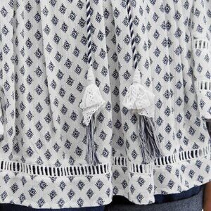 This bohemian, summer-ready top from French Connection features decorative stitching, lace, tasseled ties, all over print and free-flowing fit.