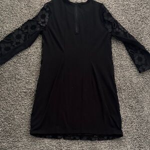Chic black dress with floral pattern. Long sleeves. Perfect for stylish outings. Fits smaller