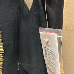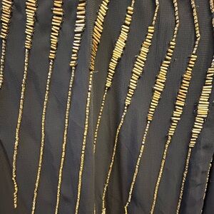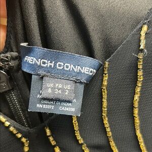 This stunning black mini dress by French Connection features a sleeveless design with a sophisticated V-neckline. The elegant sheath style is adorned with shimmering gold beads, perfect for a cocktail night out. Its form-fitting silhouette offers a modern and chic look. Sheer on the sides - from armpit to waistline. Tiny snag as seen in photo.