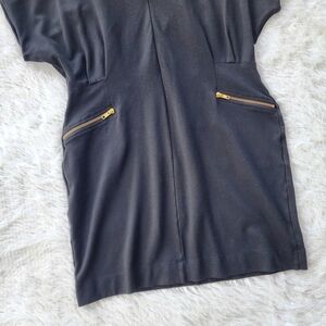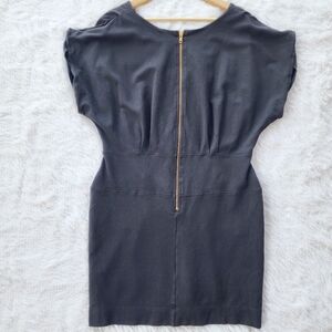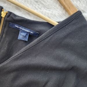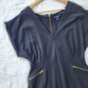 French Connection Black Gold Zipper Mini Dress. Size 12 with stretch. 66% viscose, 29% nylon, 5% elastane. V-neck. Short sleeve. Zipper pockets. Zip back closure. Mini length. Great preowned condition.