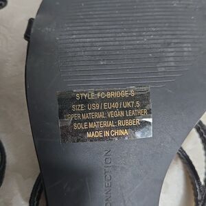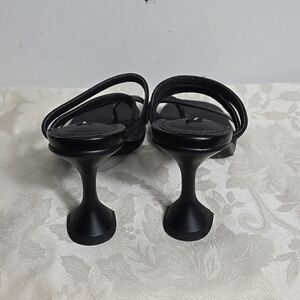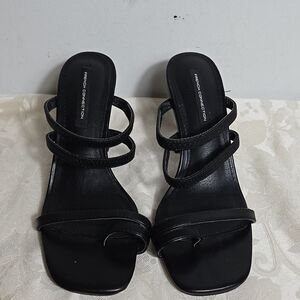 Upgrade your style with these French Connection black heels, featuring a unique sculptural heel and a sleek strappy design. The minimalist aesthetic and open toe make them perfect for a night out. Good overall condition