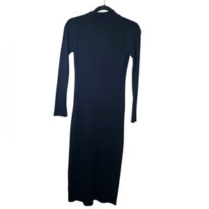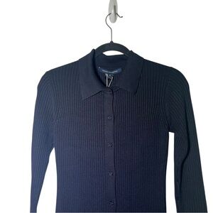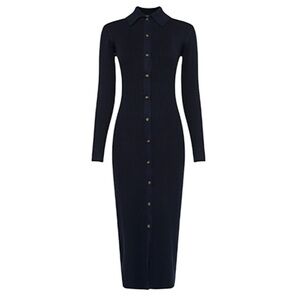 New with tags! Navy blue and black, ribbed, cardigan midi dress. A lovechild of a dress and a cardigan, the Mari Pleated Cardigan Midi Dress is designed with a tight-fitting, ribbed body, open collar and front-button fastening. In great condition. Has stretch.