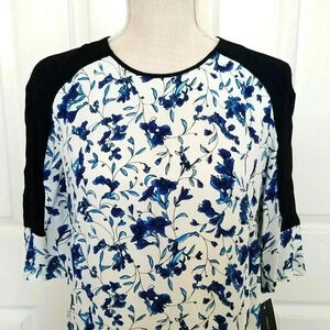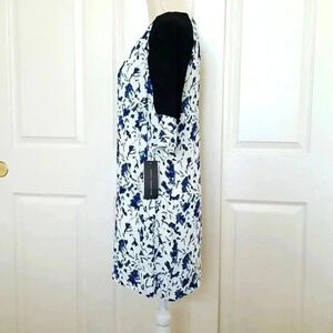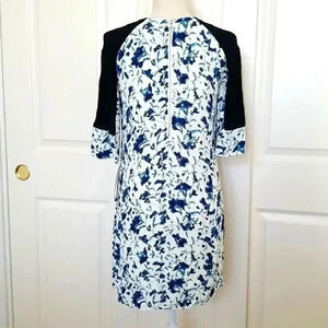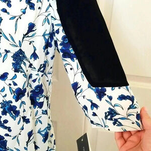 ¾ Sheer sleeve dress with floral accent on sleeves. Fully lined. Blue/black floral print on white base.