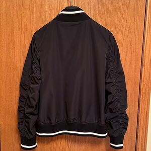Super fun bomber jacket! Black with white! 2 pockets upfront and one on the left sleeve. Dimensions: 22.5” length, 23.5”sleeve, 27” bust, 30” waist