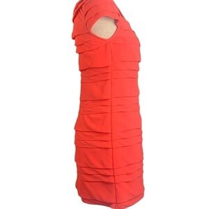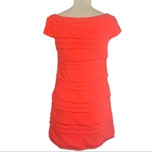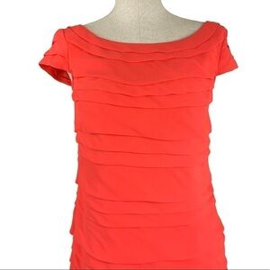 Pretty little tiered ruffle mini dress in bright coral chiffon layered over a sheath dress. Full side zipper. Cute cap sleeves. Boar neck. So chic and elegant!