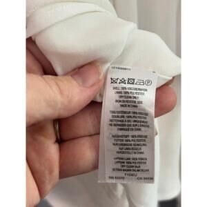 The dress is in excellent, pre-owned condition with no visible flaws. It's crafted from a high-quality, lightweight viscose/rayon blend shell and a 100% polyester lining, ensuring a comfortable and luxurious feel. A hidden back zipper closure provides a seamless look.