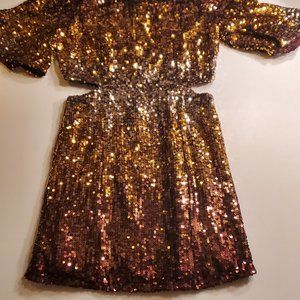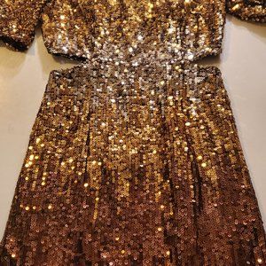 Gold ombre sequin cocktail dress. Short sleeve. New with tags. High neck with side cut-outs. 100% polyester with embellished details. Perfect party dress.