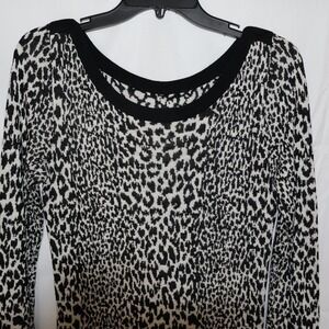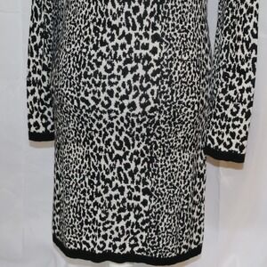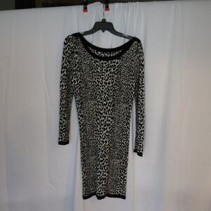 French Connection Dress. Figure flattering knit, Sz Small, length 38 inches shoulder to hem. Pit to pit 15 inches to 17 inches (stretched slightly) Leopard print black white midi, black trim neckline, hem and sleeves. Hand wash, lay flat to dry. Fashionable and form fitting.