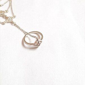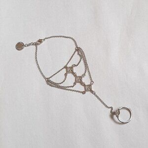 A French Connection hand chain or slave bracelet in a polished gold tone finish. This bracelet features a ring worn on the finger connected by a chain to a bracelet. The chain is adorned with diamond triangle shapes and the ring. The ring is a size 7 and the bracelet portion measures approximately 7.5 inches in circumference. It has a lobster closure.
