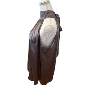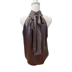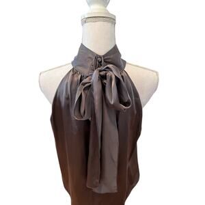 New French Connection High Neck Silk Halter Top Shark Gray, size 8. Stunning 100% silk with button detail at neck and long feminine bow