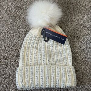 Elegant ivory beanie featuring a fluffy pom pom. Adorned with sparkling rhinestones for a chic look.