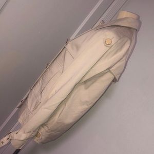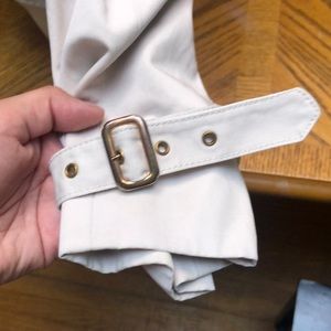 Cute. Used. Short jacket. Lightweight. Cream colored with a darker cream colored button with gold gold detail. Very faint stain on backside. Barely able to tell. No snags or rips. Feel free to ask any questions.