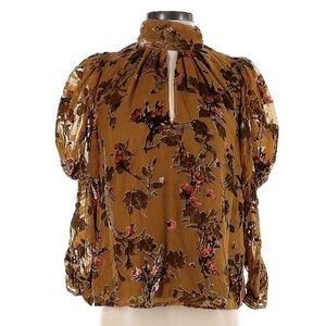 Description: Soft velvet burnout blouse features pretty all over floral motif, a mock neck with keyhole closure, and puff sleeves. Lightweight, perfect for early fall and beyond. Can be paired with denim for an elevated casual look or easily dressed up.