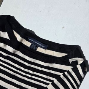 Black and cream horizontal stripes with a boat neck and long sleeves on this French Connection Bambi Marissa mini dress. Mini length and stretchy knit for easy wear. Size 6, great for layering or casual days. It's like a knit bodycon dress.