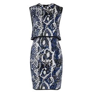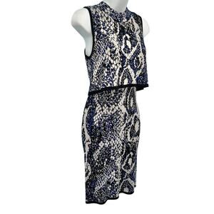 A sleek and structured bodycon from French Connection that combines sophistication with subtle edge. The heavy knit fabric flatters and smooths, while the layered bodice and contrast black piping add refined dimension. Finished with a bold boa-inspired pattern and an exposed center back zipper for a modern touch. Originally $218.
