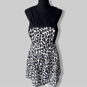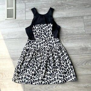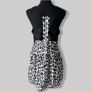 Crew neck, sleeveless, cutout racerback with elastic straps, back zip closure, paneled construction, shirred drop waist, animal pattern.
