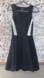French Connection "Lucy Fit" black and white A-line dress. The dress is sleeveless with a scoop neck and features white panels on the sides of the bodice. It has a fit-and-flare silhouette, with a fitted bodice and a flared skirt. The dress is made of a smooth, medium-weight fabric, and is suitable for cocktail parties or other semi-formal events.