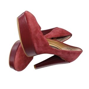Excellent used condition! Deep, maroon suede. Flattering almond toe. EU size 38 which best equates to a U.S. size 7.5.
