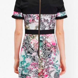 French Connection dress: multicolored with black detail, black fringe on cap sleeves and hem, lined bodice, exposed zipper, well-fitted.
