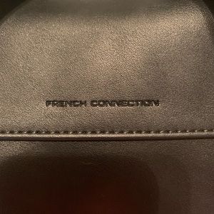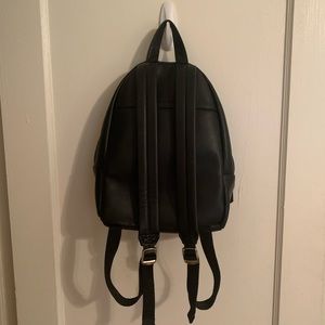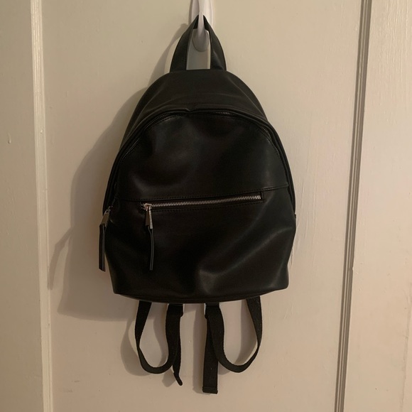 Chic black mini faux leather backpack with silver zipper detail. Includes front zipper pocket and three interior pockets