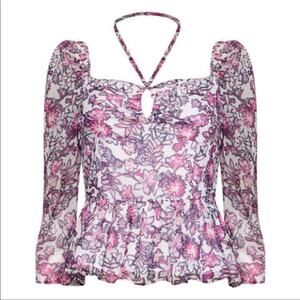This crisp poplin blouse is designed in allover blooms with slender neck ties and puff shoulders. A flouncy peplum finishes this irresistible look.