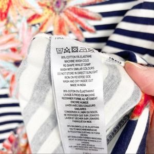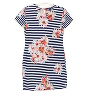 Navy and white striped dress. Features vibrant floral patterns. Short sleeves. Perfect for casual outings.