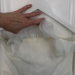 Elegant off-white mini dress. Features a charming ruffle neckline. Perfect for any occasion.