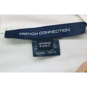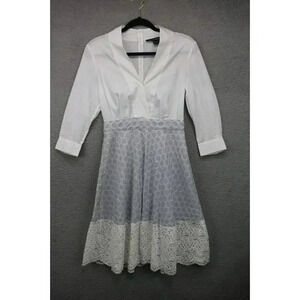 This is a French Connection Oni Lace Mix Flared Dress that is a size 2. It is 63% Cotton, 33% Polyester, and 4% Elastane. Lying flat, it measures: Armpit to armpit-16.5" and the length is 38". It has a wide lace at the bottom of the skirt. Very pretty and in great condition. It does have a small dot on the front.