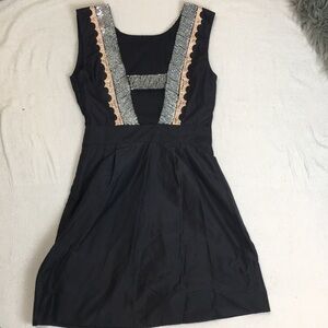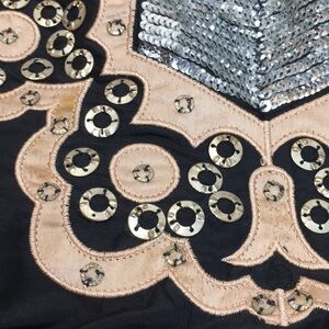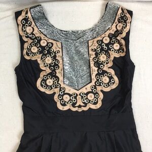 Black dress with Sequin and appliqué embellishment - hidden side zip - fully lined - size 4 - gently worn has marks on appliqués as shown in photos (possibly from metal bits that are sewn on?