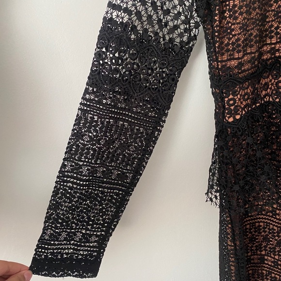 This elegant-chic black peplum midi lace dress by French Connection features a nude underdress with a black lace overlay, making it perfect for various occasions such as weddings, parties, or formal events. The long sleeves and A-line silhouette add a touch of sophistication, while the lightweight fabric ensures comfort.