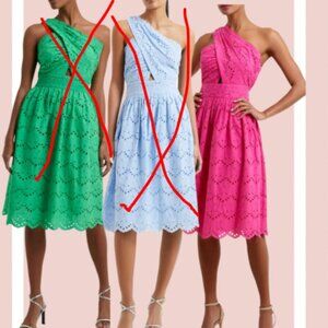 This One Shoulder Dress will be your go-to dress for all your summer plans. Knee-length silhouette showcases the detailed broderie anglaise. Delicate eyelets detail a scalloped hem midi dress punctuated by a waist cutout and pretty pleats along the bodice. Asymmetric neck with banded waist.